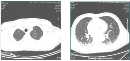 通过全科室医护人员的共同努力,患者的皮下气肿、纵膈气肿逐渐吸收,2018年4月3日复查胸部CT(见下图),患者的皮下积气、纵隔积气较前明显吸收减少,双肺间质性肺炎无明显变化,目前病情稳定,拟近日出院。