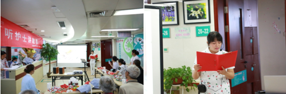 工作了快30年,今年即将退休的资深护师姚老师,饱含深情的朗读了自己的故事,医院环境的变迁,病房里的病人来来往往,说的是这些年日复一日的做好护理工作的心声;较为年轻的护士邓老师,慢慢讲述了一个“固执”老人的故事,固执,抗拒接触,不配合治疗,不表达心声,在繁忙的临床工作中,要照顾老人的情绪要担心老人的病情,只能一遍又遍的询问,无数次的关心和安慰,最后走近老人,这样一位年轻时意气风发内心骄傲的孤寡老人,内心也是一片酸楚,有太多的话找不到人诉说;声声温柔细语的游老师,向大家讲述了一个感人至深的爱情故事,两位耄耋之年的老人,爷爷和奶奶相守相依,亲身经历抢救但还是无法挽留奶奶的时候,老人的深情与无法放开的手让人落泪;科室最小的护士董妹妹,讲了自己成为护士的故事,曾任乡村医生的父亲,让小小的她立志成为 “白衣天使”,是一部小小的成长记录也是工作的心声。
