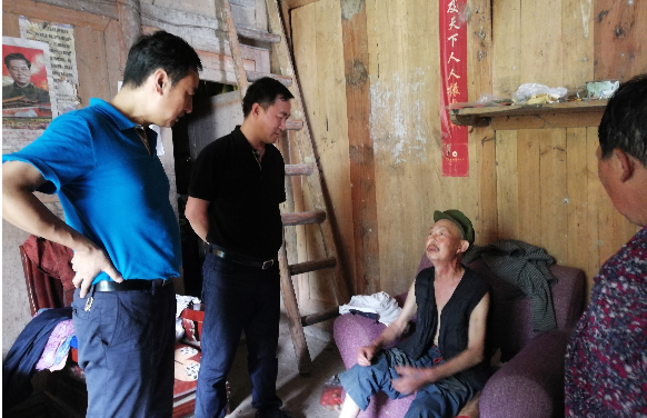 座谈结束后,王书记一行在王天宝副镇长的陪同下不顾炎炎烈日,又马不停蹄的奔赴山坳村。在与村支书田景清书记进行座谈并了解相关情况后,一行8人走进田间地头,翻山越岭,首先看望慰问了位于海拔1100多米的雷伽山头的85岁高龄独居老人任昌民,王书记代表医院给老人送上了慰问金,与老人耐心交谈,了解老人的一日三餐及身体状况,查看了老人居住条件。中间遭遇暴雨,王书记一行并没有因此而止步,接下来又看望慰问了独自照顾哑巴儿子的张恩银老人,对老人居住的卫生条件和生活来源殷殷问询。最后走访慰问了长期卧病在家的田景崇老人一家。