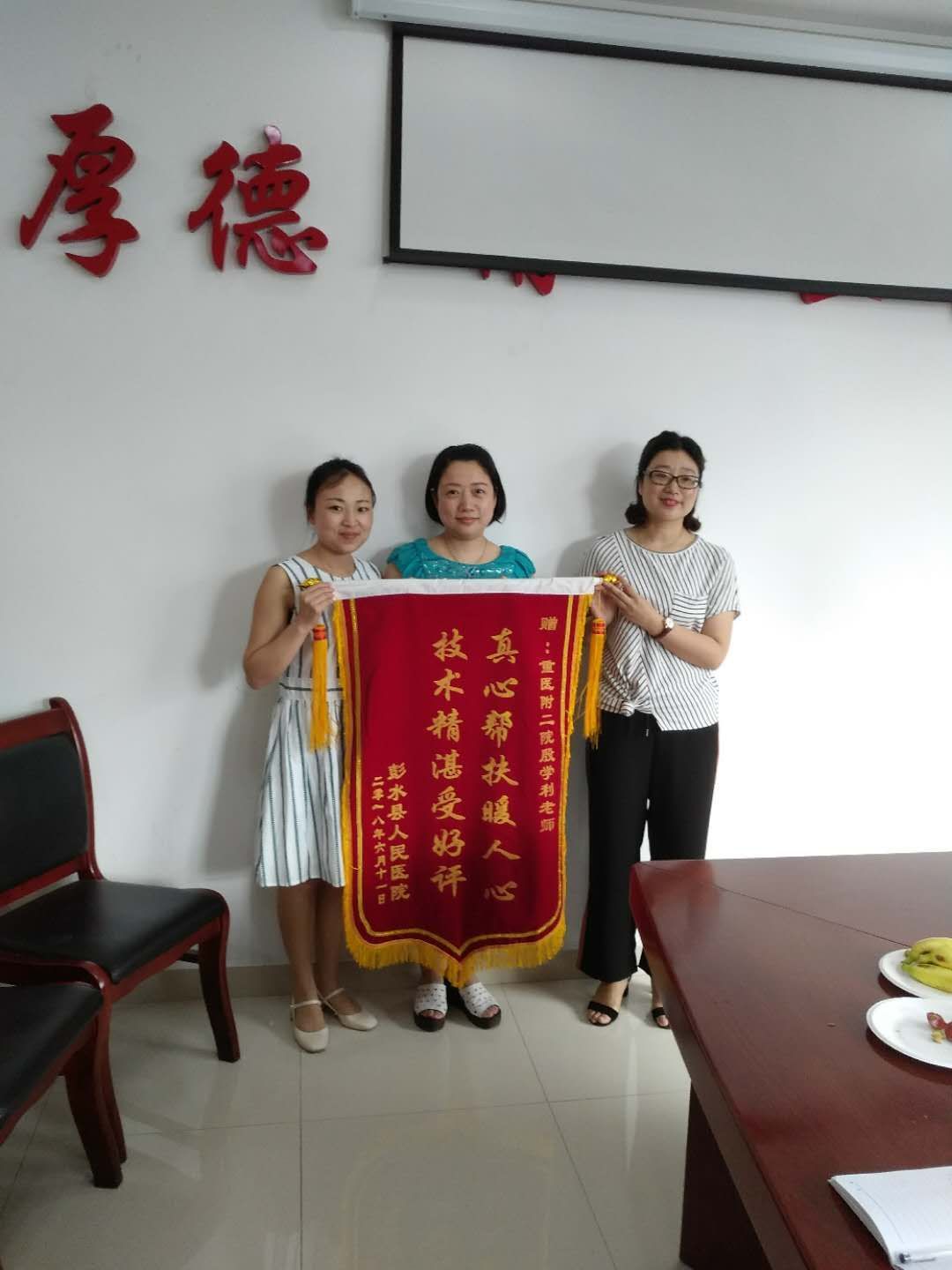 2018年6月12日,重医附二院彭水分院将一面写有“真心帮扶暖人心,技术精湛受好评”的锦旗送到造口伤口PICC门诊,感谢重医附二院下派护理专家殷学利老师给予的帮扶指导。