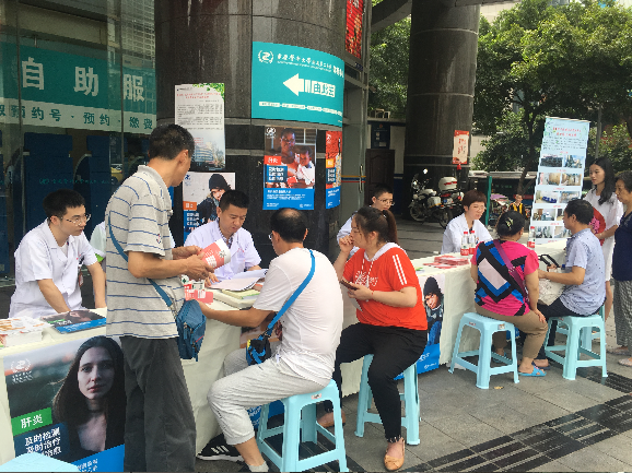 宣传活动还通过悬挂横幅、发放宣传资料等形式,使广大群众进一步了解、注重肝炎疾病,肝炎是肝脏的炎症,最常见的原因是病毒感染。有五种主要肝炎病毒,被称为甲、乙、丙、丁和戊型。乙型肝炎和丙型肝炎均为慢性感染,可能长期不出现症状,有时会长达数年或数十年。至少有60%的肝癌病例因没有及时检测和治疗病毒性乙型肝炎和丙型肝炎所致。乙型肝炎和丙型肝炎是发生肝硬化和肝癌的最常见原因。早发现、早治疗,避免更严重的后果发生。