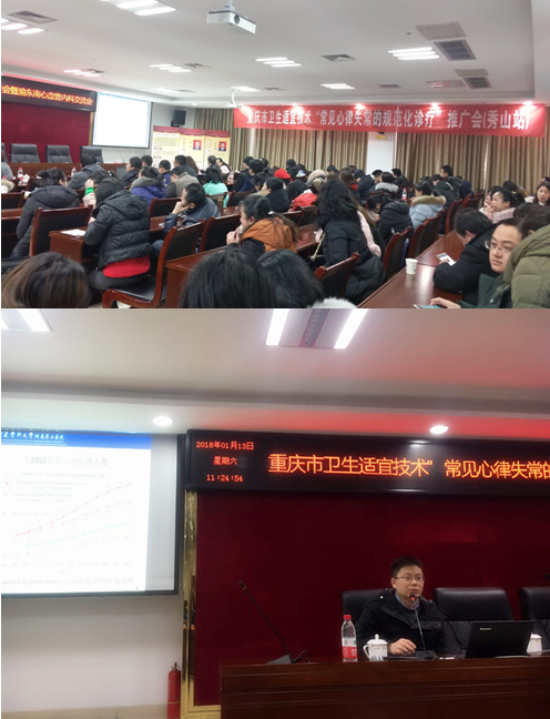 此次推广会之前项目组已在秀山人民医院及秀山各医疗单位支持下成功举办卫生适宜技术“常见心律失常的规范化诊疗”推广会(秀山站),秀山站推广活动共计137人参加。重医附属第二医院心血管内科的专家们就常见心律失常包括阵发性室上性心动过速的规范化诊疗,心律失常性心肌病的规范化诊疗,心房颤动的综合管理进行了解读。