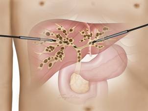 第一步在中上腹表皮上直接钻孔,经过肝脏钻孔直通肝内胆管,建立外界到肝内胆管的通道(一般1-3个孔,每个孔5mm左右),通过这个通道用微型摄像头找到结石,将结石打碎,用取石器械逐个取出肝内胆管的结石,手术结束后通过这个通道放置引流管引流胆汁。