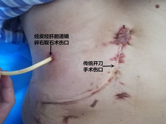 经皮经肝胆道镜碎石取石术(PTCSL)和传统开刀手术伤口情况对比图