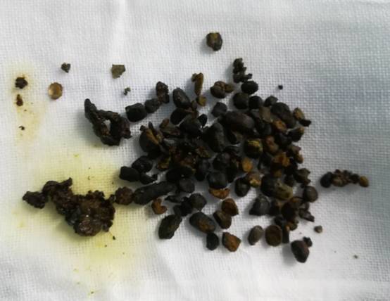 一次经皮经肝胆道镜碎石取石术(PTCSL)取出的肝内胆管结石实图