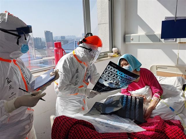 对患者来说,只要看到杜先智,就像是抓住了救命稻草,让人安心。平时,哪怕只有丁点儿时间,杜先智都会换上防护装备,来回穿梭在隔离区的两层楼查房,一待就是4小时,防护服湿了一层又一层,护目镜的雾气散了又起。“来,左手前臂向内弯曲,一下、两下…”看到患有脑梗塞的新冠肺炎危重患者,杜先智走上前,托着对方的胳膊,手把手指导侧肢体运动。转个身,他拿起邻床的CT,斜着眼睛,努力地透过没有雾气的一角观察,弯下身体告知病情走向,时不时握住患者的手,疏导她焦躁的情绪。接管病区25天以来,杜先智带领的团队共收治101名患者,治愈出院20人,22名重患者转为轻型,从2月12日至今,病区连续16天实现病亡率为0的良好医疗态势。