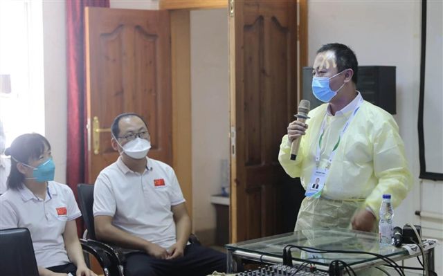 5月14日抵阿之后,中方专家组与当地卫生部、新冠肺炎疫情跟踪科学委员会、巴斯德研究院、全国公共卫生研究院等部门专家进行了多次座谈,同阿全国四所定点收治医院举行视频会议。作为一名老党员的江德鹏教授和张传来副主任护师在专家团队中,承担着授课、培训、答疑以及保障团队安全和物资供应等工作,并随队多次赴首都及外省定点收治医院和当地流行病学调查机构深入考察,与相关专家研讨诊疗技术,深入隔离病区与阿方共同诊治新冠肺炎患者,展现了重医二院医护人员的专业素质和敬业精神。