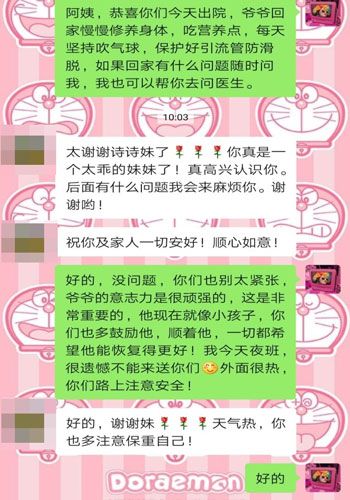 “嗯,我会配合你们的!”次日晨交班,走进熟悉的病房来到爷爷床边:“爷爷,今天感觉怎么样啊?大便颜色正常吗?我看胃管里引出的胃液都正常了。肚子有没有不舒服?”