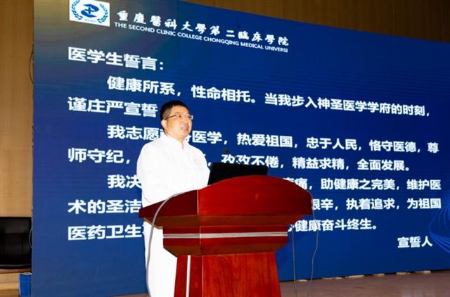 然后,抗疫英雄代表----来自传染病学教研室的主任、重庆市教书育人楷模张大志老师带领同学们进行了尊严而神圣的《中国医学生誓词》宣誓仪式,同学们用拳拳初心、铮铮誓言表达了献身医学的决心和勇气。
