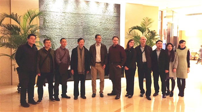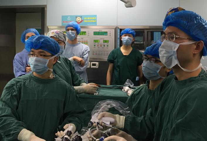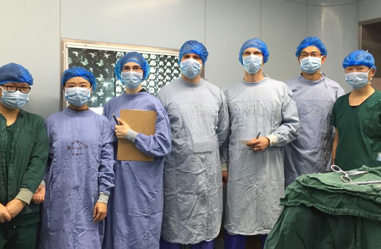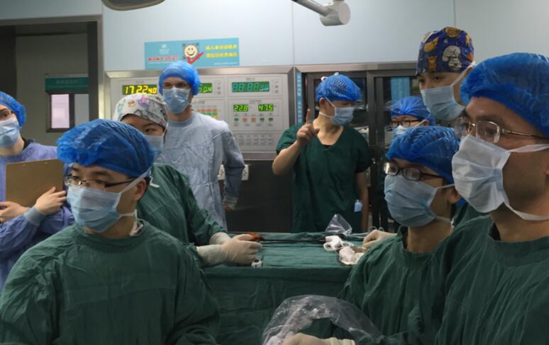 2016年1月14日,我院肝胆外科龚建平主任、刘作金副主任等一行在外科楼17楼医生办公室接待了来自全球最大的微创外科研发公司__美国强生总公司技术研发人员一行,包括强生全球研发总监Shan Wan,强生工程师Jeffery Messerly、Chad Boudreaux 、Monica Zeckel等。Shan Wan一行在龚建平教授的带领下来到重医附二院手术室,全程参观了由刘作金主任医师主刀完成的全腹腔镜下巨大脾肿瘤切除术;涂兵教授完成的开腹左半肝切除-胆肠吻合术;李生伟副主任主刀完成的胰十二指肠癌切除术。外宾们对中国医生们的精湛手法啧啧称奇。