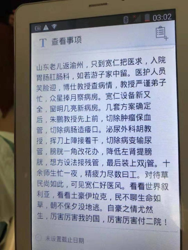 当中写道:“重庆老儿山东来,重病初诊是肠癌,吓坏七旬老汉我,来到宽仁把祸躲……科学诊断设备新,朱鹏教授亲身问……重疾痊愈已数载,老儿竟要寻真爱……感谢宽仁医术高,感谢宽仁有担当……”