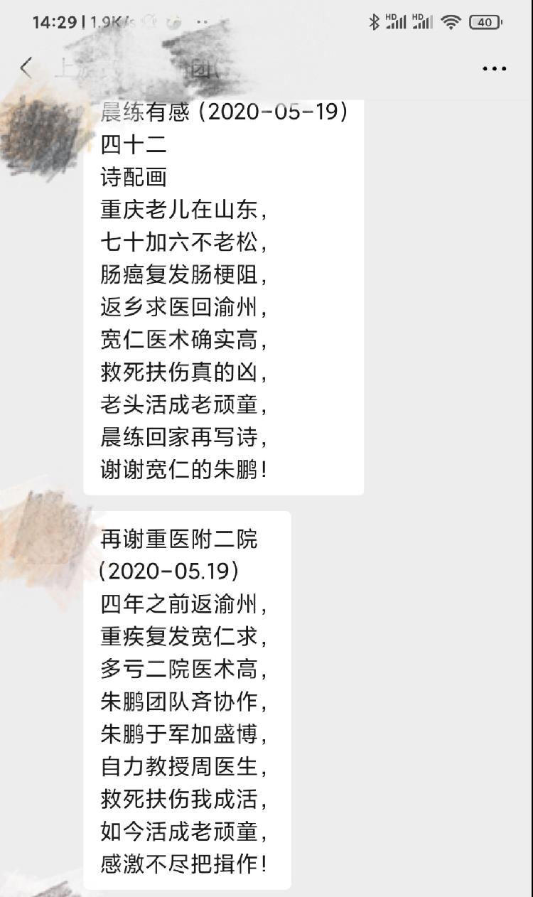 “四年之前返渝州,重疾复发宽仁求,多亏二院医术高,朱鹏团队齐协作,朱鹏于军加盛博,自力教授周医生,救死扶伤我存活,如今活成老顽童,感激不尽把揖作!”