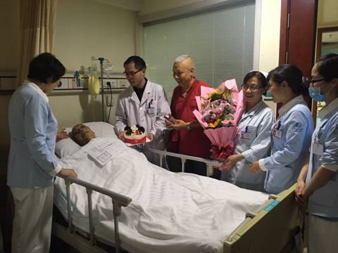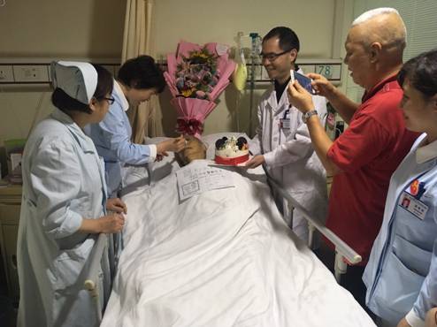 两位老人的爱情故事感动着整个病房,肝胆外科全体医护人员决定为这位特殊的患者庆祝70周年结婚纪念日。科室主任和护士长带领着医护人员,把结婚纪念日蛋糕和鲜花送到周爷爷的病床旁,老人感动地说:“谢谢科室领导和大家的关心,等我好了,我还带着老伴儿回来看看你们!”