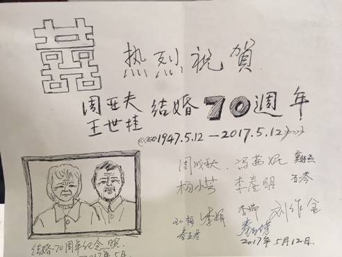 2017年5月12日,是周爷爷术后第二天,老爷子精神特别好,拿着手机温柔地跟电话另一端的人说:“你今天早点儿来看我哦,我要跟你好好亲热一下。” “腻歪”了一会儿,他得意地跟护士说,今天是他们结婚70周年纪念日,他想跟他的妻子一起度过。