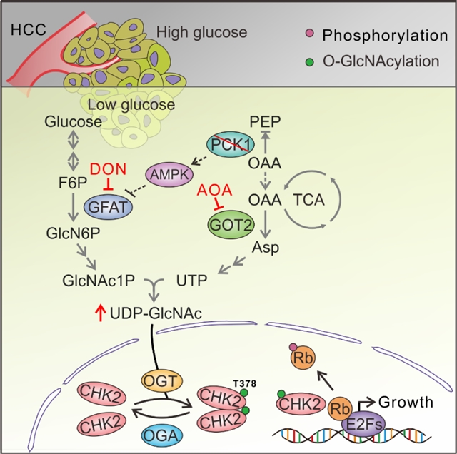上述研究结果揭示了在葡萄糖缺乏条件下糖异生关键酶PCK1低表达或缺失促进HBP途径和维持肝癌增殖的作用,解析了PCK1缺失促进UDP-GlcNAc生物合成和O-GlcNAc修饰的分子机制,并揭示了CHK2 蛋白新的翻译后修饰——O-GlcNAc糖基化修饰在肝癌发生发展中的重要性。同时,该研究发现AOA和DON可以通过靶向HBP途径介导的 UDP-GlcNAc合成,从而抑制Pck1敲除小鼠肝癌生长,为肝癌提供了一种新的潜在治疗策略,有望促进开发以代谢为靶标的抗肿瘤药物。