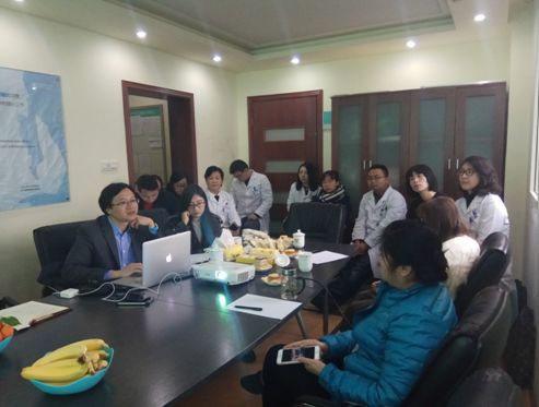 1月24日上午,在妇产科主任胡丽娜教授的主持下进行座谈。首先杨飞教授结合自己的研究领域向我们展示了中国科学院化学研究所研究团队的研究优势和研究成果。具体包括生物降解高分子的设计、合成和改性;针对不同修复组织的不同宏观和微观表面结构、不同组成和微环境的组织工程支架的设计、构建与改性;复杂的复合材料以及自组装技术在组织工程方面的应用;长效控释、响应性释放、靶向释放、诊疗一体等药物控制释放体系的研究。然后胡丽娜教授向杨飞教授介绍了我院生殖与发育干细胞研究中心,该中心重点开展干细胞在生殖与发育领域的基础、临床应有及转化的研究。近年来专注于人羊膜上皮细胞改善和提高生育能力的转化研究,建立了产学研平台。随后胡丽娜教授将干细胞应用于卵巢早衰以及宫腔粘连的研究思路与杨飞教授进行深入探讨。双方达成合作共识,对课题研究进行了进一步的规划和具体的任务安排。