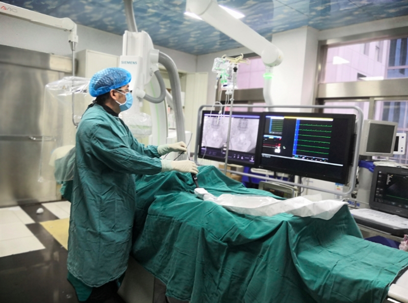 在充分的术前准备后,6月23日,手术如期进行。在手术医师为患者实施局部麻醉后,陈运清教授带领团队运用心腔内超声术(ICE),将只有三个多毫米直径的微小超声波探头,通过病人大腿股静脉直接送到心脏内部。这就如同给心脏内部安装了一双“天眼”,将心脏各个心房、房间隔、心室、心耳及肺静脉等结构探查得一清二楚。随后在“天眼”的直视和引导下,陈运清教授凭借丰富的手术技巧,轻松找到“卵圆孔未闭处”,精准进行调节和释放封堵伞,封堵住缺口。