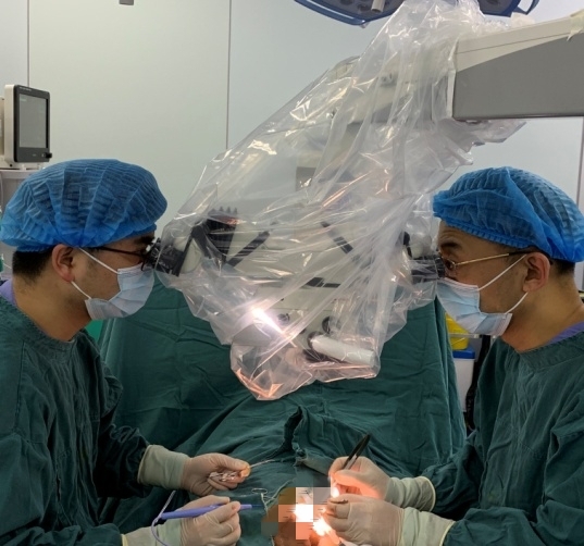 (梁培禾教授等为患者实施显微镜下手术)