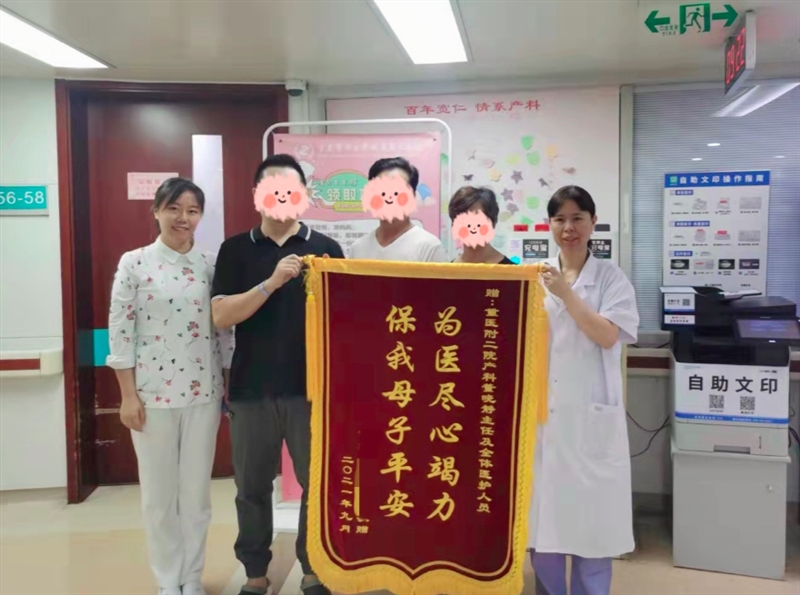 张女士和健康的新生儿一起幸福地入住月子中心期间,其父母及丈夫又再次来到重医附二院产科,为董晓静教授及团队送上锦旗,热泪盈眶地一遍遍诉说着感谢。