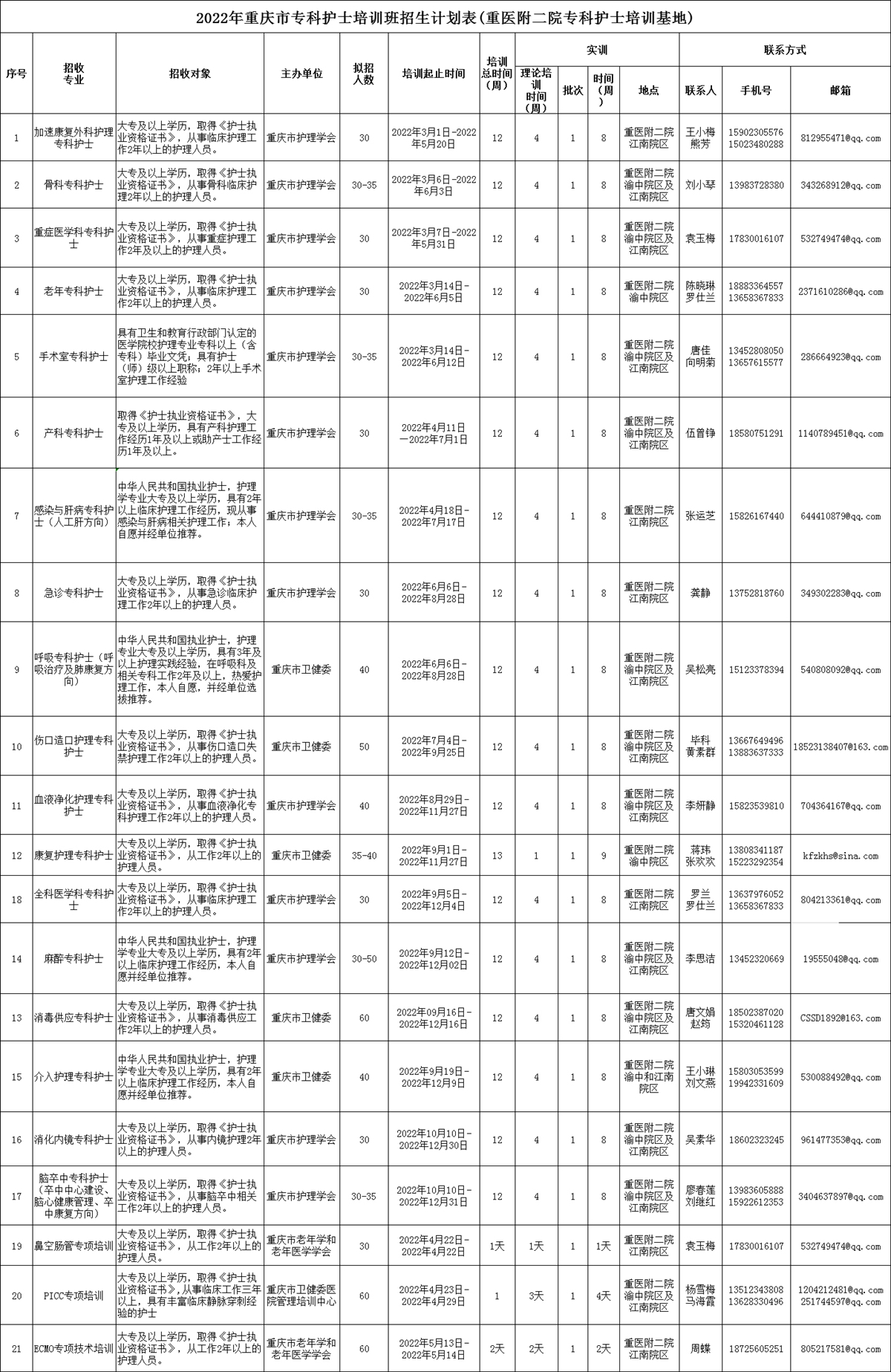 2022年重庆市专科护士培训班招生计划表(重医附二院专科护士培训基地)