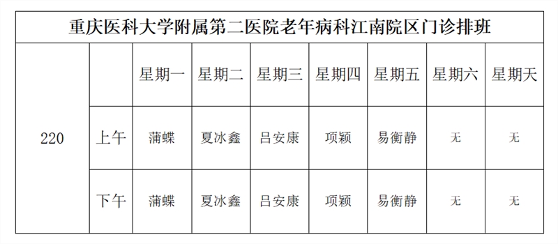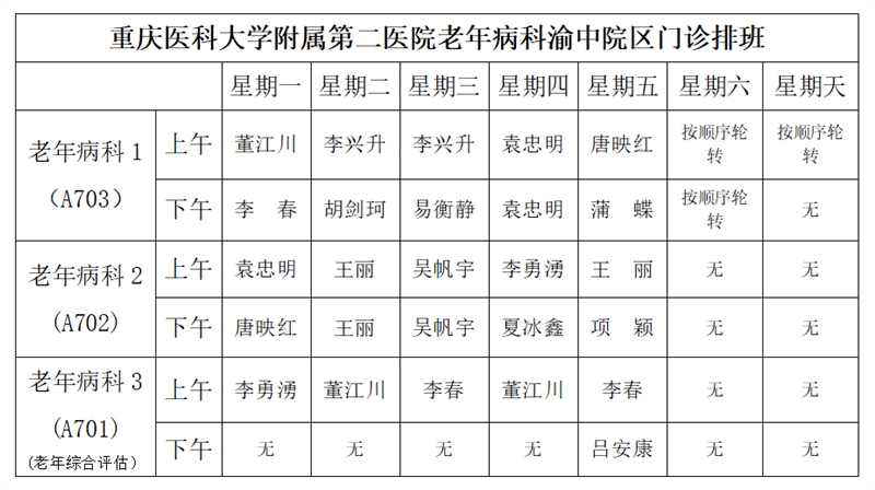 重庆医科大学附属第二医院老年病科,是重庆市最大的诊治老年性疾病的综合性学科之一,重庆市最早一批建立的独立老年医学学科,重庆市教委重点学科,重庆市第一个老年医学博士学位授予点,重庆市老年医学临床研究中心,重庆市老年专科护士培训基地,并建立了心、脑、外周血管功能检查室及老年心血管疾病介入诊疗中心。科室在老年心血管疾病诊治水平进入国內先进行列,在西部率先开展经桡动脉介入诊治老年冠心病,年均进行介入诊疗手术近1000台。