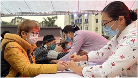 医护人员为群众测血糖、量血压。摄/马甜