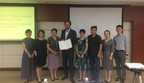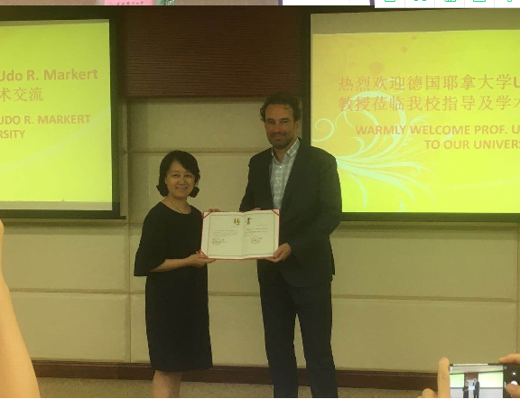 7月3日下午两点半,Udo R. Markert教授一行又来到了重庆医科大学生命科学研究院317学术报告厅,为学校师生进行生殖免疫学研究的讲座。讲座由学校科研处刘湘副处长主持。讲座开始前,杨竹副校长首先对Udo R. Markert教授的到来致以热情洋溢的欢迎词,并向教授颁发了客座教授聘书,正式聘请Udo R. Markert教授为我重庆医科大学客座教授。学校外事处杨红处长及附属第二医院科研处黄慧哲副处长、妇产科胡丽娜主任、张觇宇副主任也出席了欢迎仪式。
