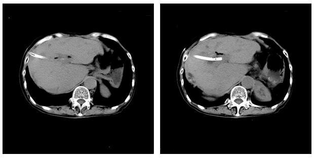 图2患者术后CT检查。肝内胆管未见结石,肝内胆管有一直径约5毫米的引流管用于术后引流胆汁,引流管在出院前拔除。