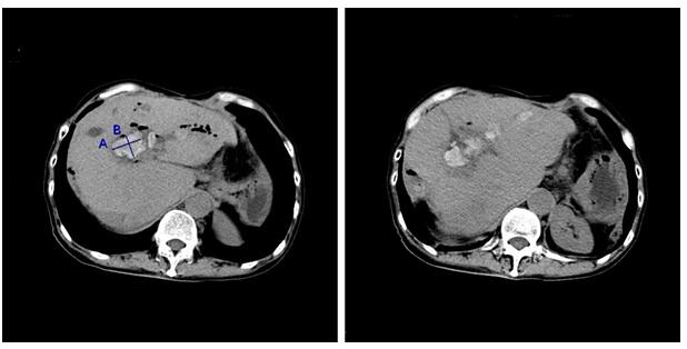 更不幸的是,今年年初,周某复查发现肝内胆管结石又复发了。周某采用保守消炎治疗,短短半年时间,反复寒战,发烧,肚子痛5次,并且眼睛和皮肤越来越黄。为求治疗收入我院。入院后完善腹部CT检查,发现周某肝内胆管又长了许多结石,主要集中在肝门胆肠吻合口附近和左边肝内胆管,导致肝内胆管明显扩张(见图1)。当我们和周某商量下一步治疗方案的时候,周某说自己做了4次开刀手术,非常惧怕再次开刀。我们深表同情,有没有办法不开刀,肚子上打个小洞就能取出肝内胆管的结石呢?