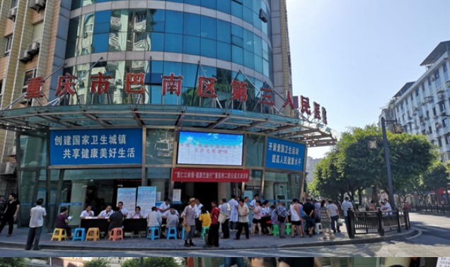 2018年7月20日上午8点,重医附二院“宽仁江南情,健康巴渝行”系列义诊活动第2场,在重庆市巴南区第三人民医院(木洞中心卫生院)举行。对外办组织肝胆外科、妇产科、胸心外科、神经外科、胃肠外科、泌尿外科、急诊科、眼科、康复科、心血管内科、内分泌科、消化内科、神经内科以及临床技能中心等14个科室共23名医护人员,冒着炎炎夏日,在木洞中心卫生院门口为木洞镇百姓提供免费义诊咨询,以及免费测血压、测血糖服务。本次义诊发放江南院区宣传册约两百余份,免费接诊218人次,免费发放防暑药品500余元。