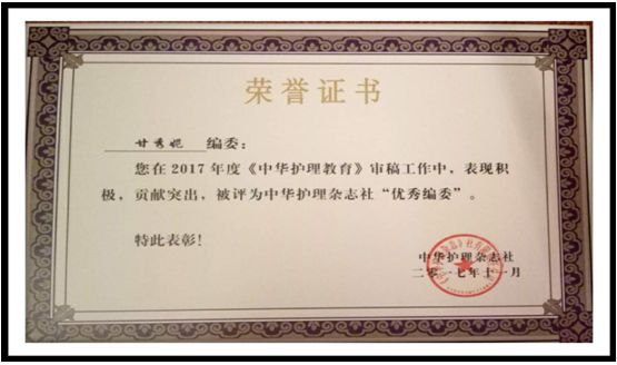 2017年11月3日,以“引领、创新、发展”为主题“中国护理科研高峰论坛暨中华护理杂志社系列期刊编委工作会议”在安徽合肥召开,为护理科研交流与协作搭建了平台,进一步开阔了中国护理科技工作者的学术视野,同时加强科技期刊管理,推动学术创新与融发。我院护理部主任甘秀妮教授,在《中华护理教育》审稿工作中表现积极,贡献突出,被中华护理杂志社评为“优秀编委”。