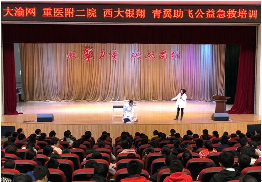 2017年11月24日,重医附二院携手大渝网展开了“青翼助飞”第11期公益活动,由来自重医附二院护理部美国心脏协会心血管培训中心的导师,消化内科青年文明号护士长王俊莉和助手谈文静、易鑫为西南大学附中银翔校区的900名同学进行心肺复苏急救培训。