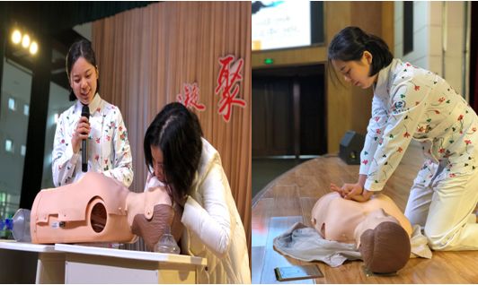 王护士长通过幻灯讲解,并与谈文静一起进行示范操作,一步步详细分解了每一个步骤的动作要点,如胸外心脏按压的手势、按压次数、着力点、打开气道的方法等。