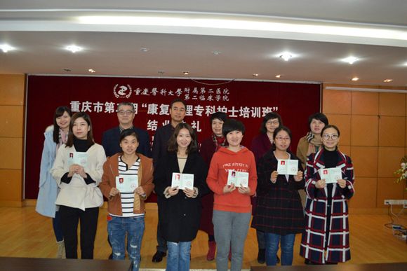 2017年12月1日上午,重庆市第二期康复护理专科护士培训班圆满结业。结业典礼由重庆市康复护理专科护士基地负责人、康复医学科护士长蒋玮主持,我院王大刚书记、护理部甘秀妮主任、康复医学科虞乐华主任、外科科护士长陈文君、神经内科廖春莲护士长、康复医学科副护士长李晓玲以及各临床实践科室的带教老师出席了结业典礼。