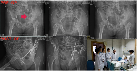 患者黄某某,女,61岁,因“车祸致左髋疼痛、意识障碍3小时”入院。X片及CT提示:蛛网膜下腔出血,骨盆左侧粉碎性骨折包括左侧髂骨、左侧耻骨上下支骨折,以及左侧髋臼骨折,双侧多发肋骨骨折,急性创伤性肺损伤,左肾及胰腺损伤。患者年龄大,全身多脏器损伤,其中左侧髋臼双柱及四边体粉碎严重(B3型),出血量大,伤后即出现休克失代偿表现,入院时ISS评分:34分,属于严重多发伤,死亡率极高。在简华刚主任带领的团队日夜辛苦的奋战下,争分夺秒地与“死神”展开搏斗,通过积极抗休克、脏器保护及营养支持治疗,为下一步实施骨盆及髋臼骨折赢得手术机会。在输血科的大力支持下,入院后予以大量输入悬浮红细胞及血浆(术前输血1600ml),患者生命体征逐渐平稳,休克得以纠正,在与“死神”的搏斗中取得了第一阶段的胜利。严重多发伤患者的救治有4个窗口期,其中,第一个窗口期在伤后1-5天,在这个期间主要稳定患者的生命体征,减轻SIRS反应,防止多脏器功能衰竭(MOF)的发生,骨折仅做简单的固定;第二个窗口期为手术期,为伤后5-10天,这个期间患者的全身的病理生理情况相对稳定,应该积极手术,尽最大可能恢复患者的功能。因此,在伤后5天,在简华刚主任主持下,全科讨论患者的手术时机、方式及围手术期的准备,综合讨论意见认为:患者目前全身情况相对稳定,应一期手术恢复患者髋臼骨折的连续性及稳定性,同时由于患者左侧骨盆粉碎性骨折,特别是髋臼前方及四边体粉碎严重,分离移位明显,出血量大,术前应该与家属详细沟通风险,并充分备血;与麻醉科沟通,术中采取控制性低血压,以减少术中出血。在麻醉科、输血科的大力支持下,在简华刚主任指导下,由宗建春博士主刀,顺利为该患者实施左髂骨及左髋臼骨折切开复位内固定手术,在与“死神”的搏斗中取得了第二阶段的胜利。术后通过有效的营养支持、预防感染等治疗,患者切口愈合良好,各方面指标均正常,肢体功能达到优良,有效地防止了多器官功能衰竭的发生,在与“死神”的搏斗中取得了最终的胜利,患者及家属都露出了满意的笑容。其中患者女儿的一段话让我们尤为感动:“我们都对前一阶段的治疗效果特别满意,非常感谢您!毫不夸张地说,让我免于面对人生最大遗憾...”。这让我们感到作为医生的强烈使命感和责任感,创伤不仅是社会问题,更重要的是家庭问题,处理不好对一个完整家庭可以带来灾难性的后果,作为创伤科医生我们如履薄冰,深感重任在肩。
